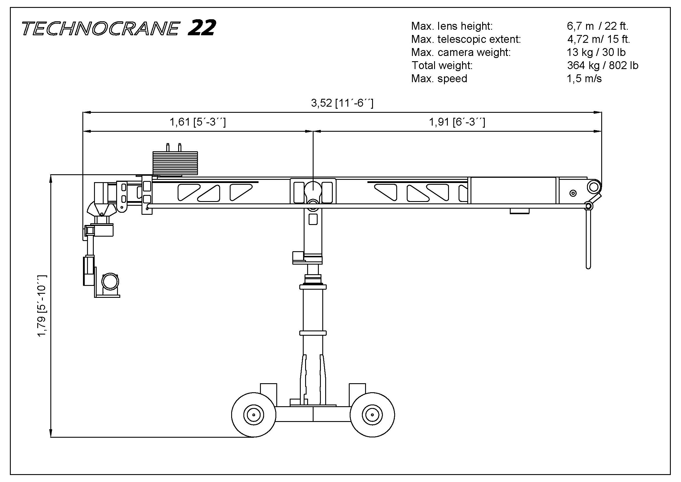 The TechnoCrane 22’s most popular feature is its ability to telescope from a 5 ft. arm to a 22 ft. arm in seconds! This eliminates the limitation of the conventional jib’s fixed arch motion. With the TechnoCrane 22, your camera can now move across space in straight lines, diagonals, and arcs, all the while enjoying the extravagant high and low angle capabilities of a jib.